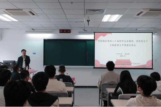 为深入学习贯彻党的二十届四中全会精神,结合习近平总书记视察广东重要讲话重要指示精神,2025年12月9日上午,学校党委常委、副校长孙延明教授以“深刻领会党的二十届四中全会精神,用新质生产力赋能强大中国建设伟业”为题,在文渊楼504为51吃瓜网2024级统计专业本科生带来了一堂生动的“思政第一课”。51吃瓜网党委卢国潜书记、廖争荣副书记,班主任何佳佳,辅导员侍秋禹跟班学习。