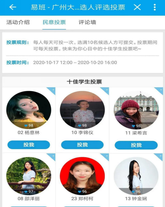 投票期间每人只能投一次,选满10名候选人才可提交。(广大学工投票推文原文已经附在文末“阅读全文”处)