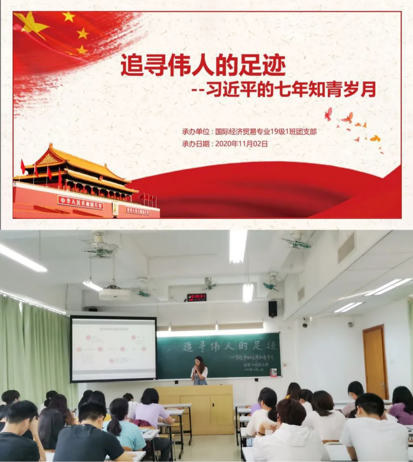 为进一步学习党的十九大精神和习近平总书记青年工作思想,国贸191团支部11月2日于文新楼414教室开展了以“追寻伟人的足迹”为主题的微团课,共同学习《习近平的七年知青岁月》。此次团课分为四部分:一、全体同学肃立奏唱团歌;二、多名同学积极分享读后感,现场响起阵阵掌声;三、团支书从家国情怀、理想追求、进取精神、良好作风和良好品质五方面进行书籍详解,同学们认真听讲、积极讨论;四、观看视频并作总结。