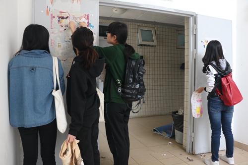 天空灰蒙,而胸前的党员徽章闪亮,大家的热情丝毫不受这沉闷天气的影响。党员们带来扫把、垃圾铲、抹布和水桶等清洁工具,在经过简单的小组和责任分工之后,各人拿着清扫工具就投入到此次的卫生大扫除行动中。你提水来我洗地,一齐来把栏杆擦,铲去墙上的牛皮癣,挑出绿化带中的杂屑,一会儿功夫就把垃圾桶填满了。经过一个中午的努力,宿舍公寓内大部分垃圾被清扫干净,墙面焕然一新。